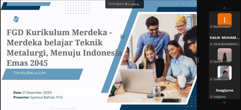 Kegiatan FGD dimulai dengan pemaparan rencana kurikulum yang disusun oleh Program Studi Teknik Metalurgi. Pada sesi pertama ini, para dosen dan pengelola program studi menjelaskan secara rinci mengenai struktur kurikulum yang diusulkan, termasuk mata kuliah, kompetensi yang ingin dicapai, serta kaitannya dengan perkembangan teknologi metalurgi dan kebutuhan industri. Peserta dari kalangan praktisi, akademisi, dan alumni diberi kesempatan untuk memberikan masukan dan saran yang dianggap dapat memperkaya kurikulum yang diajukan.