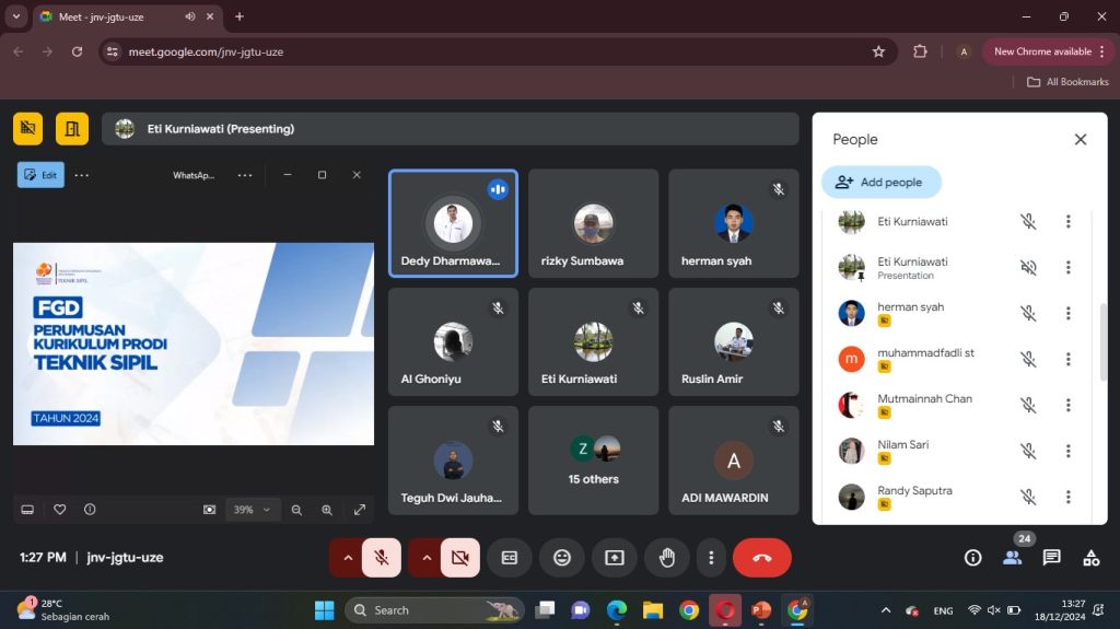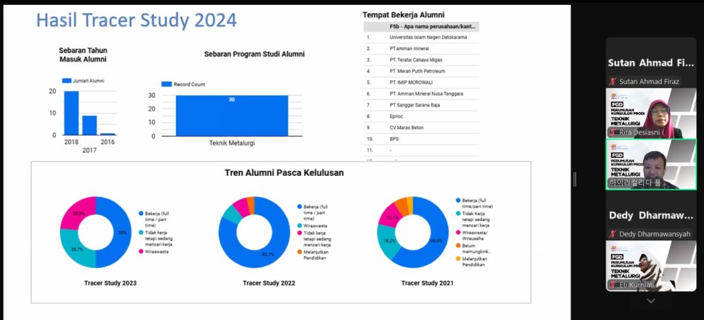Sumbawa, 18 Desember 2024 – Fakultas Teknologi Lingkungan dan Mineral (FTLM) Universitas Teknologi Sumbawa (UTS) menggelar Forum Group Discussion (FGD) untuk membahas pengembangan kurikulum Program Studi Teknik Sipil dan Teknik Metalurgi pada Rabu, 18 Desember 2024. Kegiatan ini dilaksanakan secara daring, dengan menggunakan dua platform berbeda, yakni Zoom untuk Program Studi Teknik Metalurgi yang dimulai pukul 09.00 WITA, dan Google Meet untuk Program Studi Teknik Sipil yang dimulai pukul 13.00 WITA.