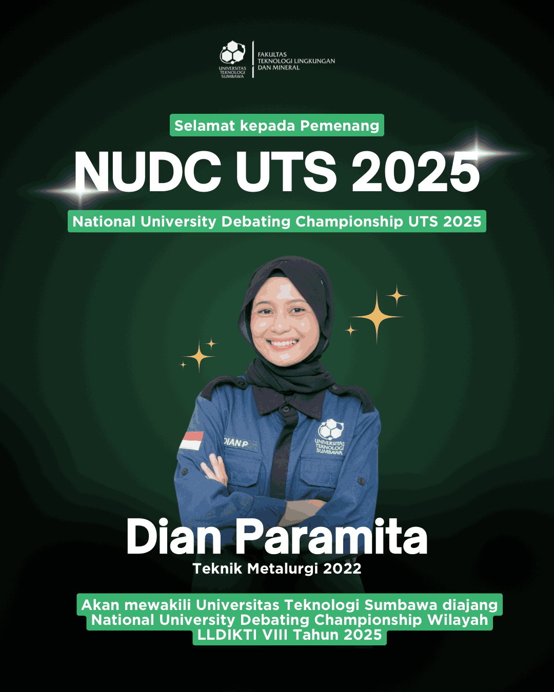 Dian Paramita, mahasiswa Program Studi Teknik Metalurgi 2022 Fakultas Teknologi Lingkungan dan Mineral, berhasil meraih juara pada National University Debating Championship (NUDC) Universitas Teknologi Sumbawa 2025. Prestasi gemilang ini tak hanya menjadi kebanggaan bagi kampus, namun juga memberikan Dian kesempatan untuk mewakili Universitas Teknologi Sumbawa di ajang National University Debating Championship Wilayah LLDIKTI VIII Tahun 2025.